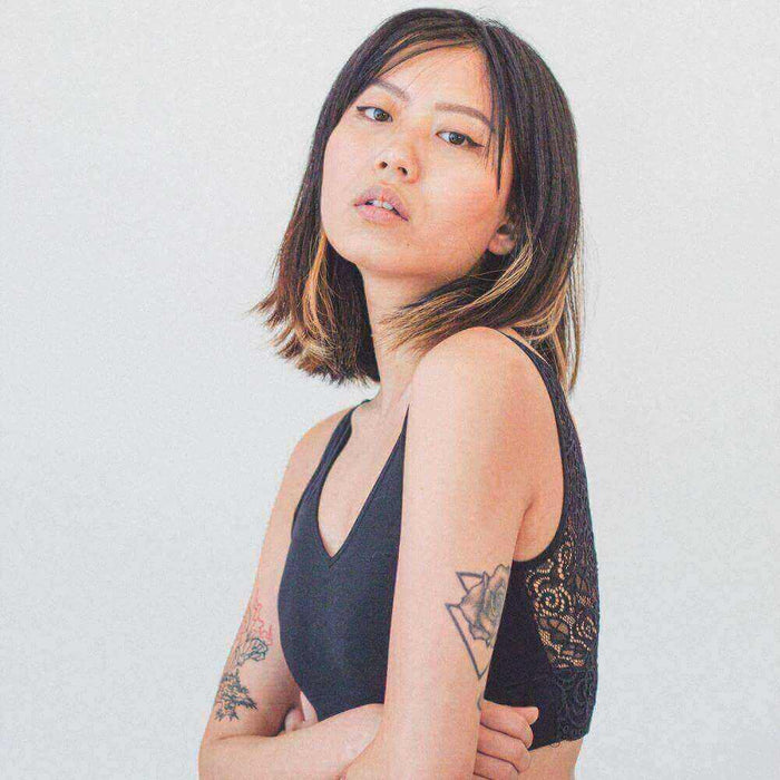 Beauty meets function in this cute reversible bralette top. This bralette lace top is reversible to be worn lace-front. The Soft V Lace Bra can also be used as a sleep bra, lounge bra, everyday bra, and low-to-medium impact sports bra.